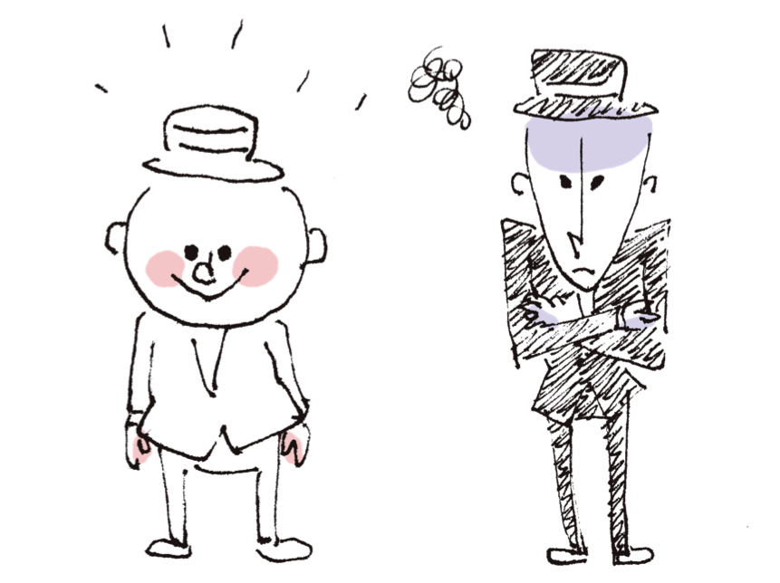 この小さな冊子に体温を与え、優しく導いてくれるキャラクターをつくりました。左の「幸せな商人」と右の「未幸せな商人」の二人です。