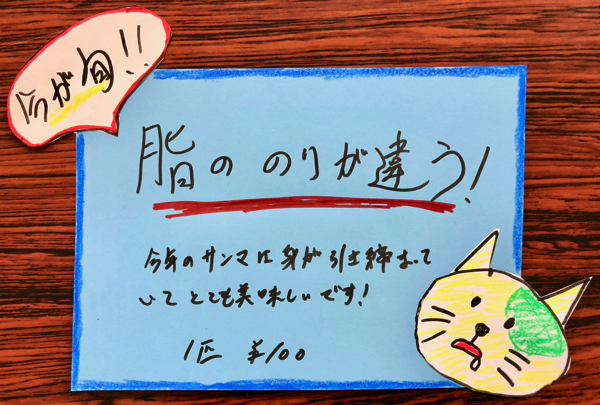 こちらの猫ちゃんの顔がツボ!笑 実物がなくても、POPだけでサンマが美味しそう〜!
