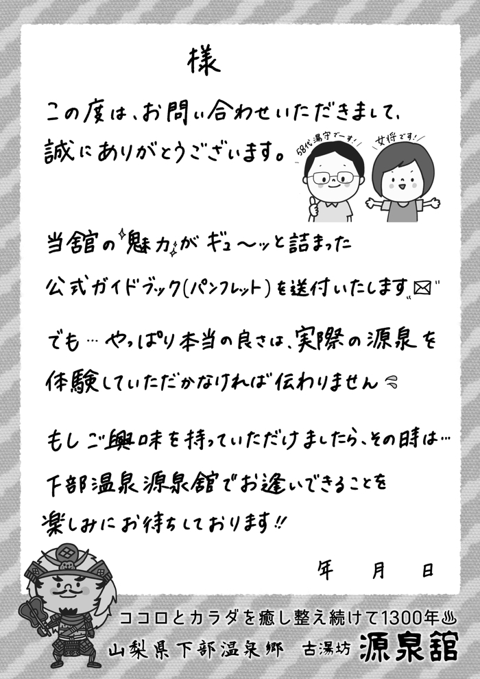 源泉舘の娘さんたちから、パンフレット送付状のリニューアルの依頼があり、「はて、それは一体どんなものだろう?」と思っていると、実物を見せてくれました。