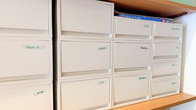 上から下まですべて文房具や画材、セミナー用の機材が詰まっています!