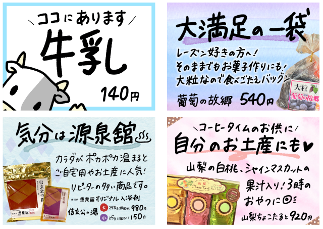 源泉舘さんは売店の全商品に手書きPOPが付いているのはもちろん、舘内のあちこちにPOPがあります。