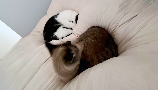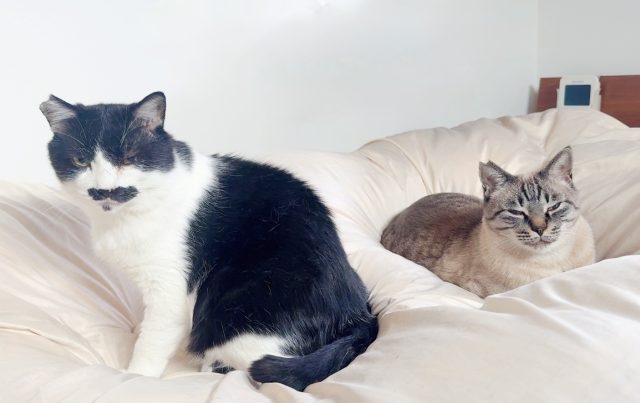 体が重い…腰が痛い…とうなされて起きると、トータル12kgの猫2匹が私の上に。そ〜っと足を引き抜き、静かにふとんから這い出る朝。