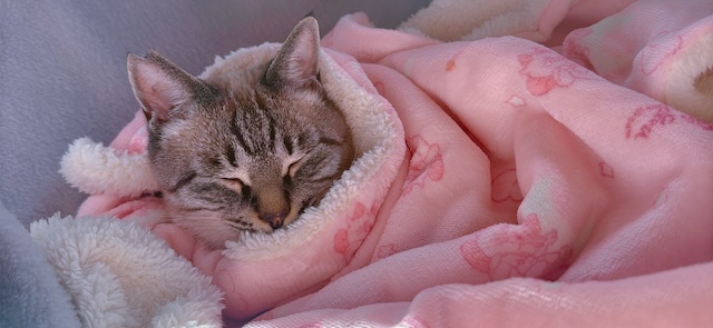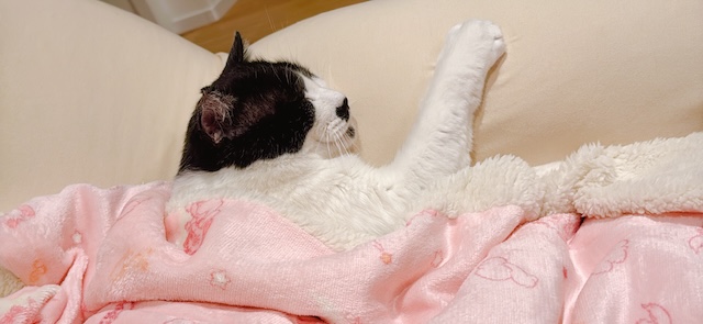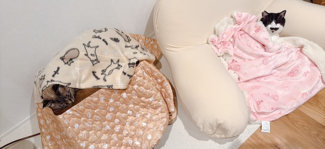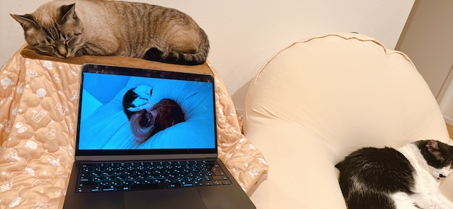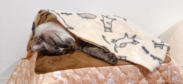 まもなく、なぜかてつがこたつに来てまたもや場所を奪われたので、邪魔にならないように、そっと毛布をかけてデスクに戻りました。