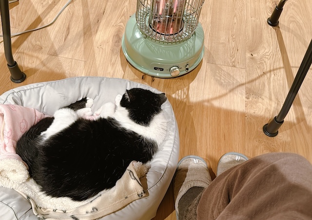 デスクワーク中にストーブをつけると、ちょびがストーブ前を占領。眠るちょびの邪魔をしないように、パソコンごと移動して端っこで静かに仕事再開。