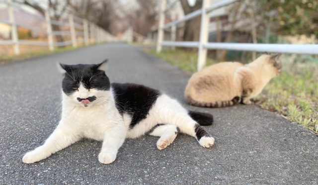 元ボス猫のちょびと出逢って以来、毎日ちょびに会いに行って遊んでいました。その様子をいつも草に隠れながらじっと見ていたてつが加わるようになり、いつしかてつはちょびの縄張りの一員に。