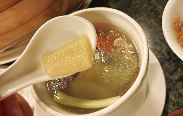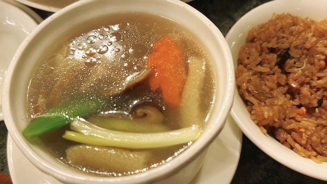 優しい味のスープは、中に指サックみたいな謎の食感の具材が入っていて、最後までこの正体はわからず。