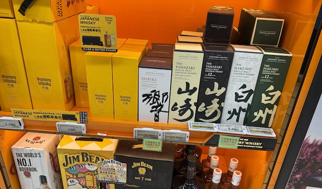 売り場にはなんと白州、山崎、響きがずらり!めちゃくちゃ高額かと思ったら、思ったより安い。