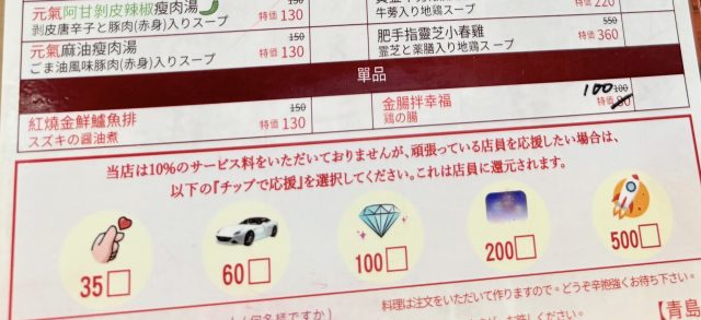 こちらです!サービス料をいただいてないけど、頑張っている店員を応援したい場合は「チップで応援」にチェックマークを入れてね!というもの。