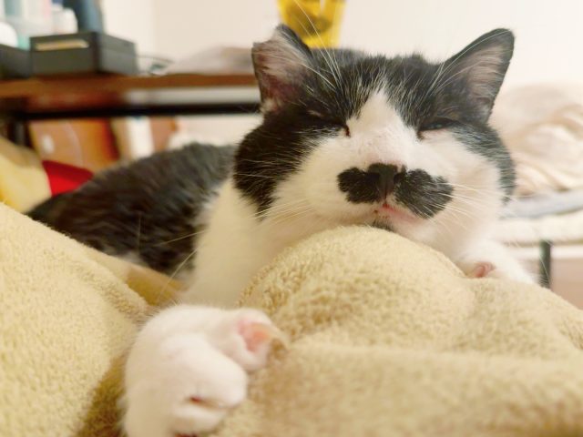 怖がって逃げようとするびしょ濡れちょびをなんとかドライヤーで半分乾かしてポカポカの2階に連れていくと、日向ぼっこしながらあっという間に乾いてくれました。