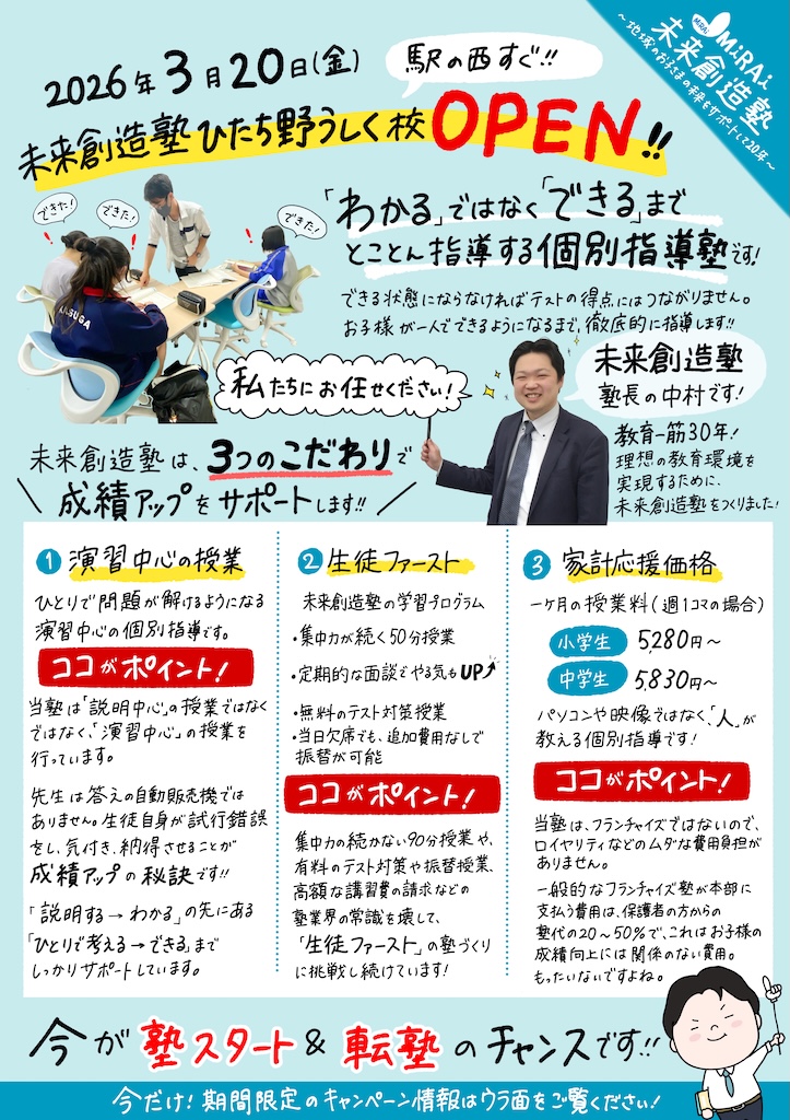 またまた新校舎オープンの未来創造塾さん。「生徒ファースト」の授業が人気で、教室がどんどん増えています!